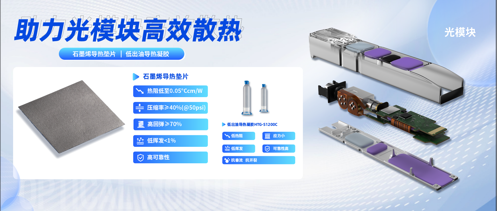 鸿富诚依托深厚的材料研发积淀,推出包括高性能导热垫片、凝胶、取向石墨烯导热垫片在内的多元化热管理产品矩阵,致力于为光模块提供从芯片级到系统级的全方位散热保障。