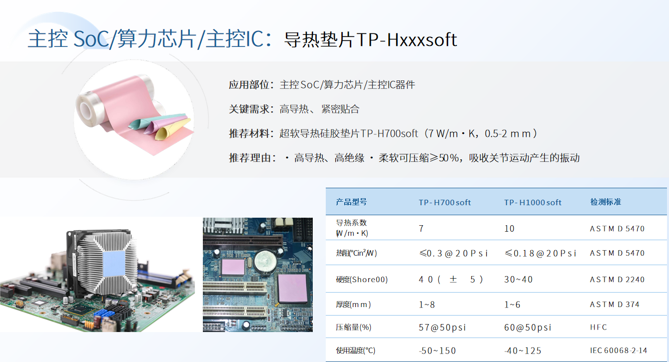 某头部机器人企业的主控芯片,集成了CPU、MCU、BPU、GPU、RAM等多种高算力器件,整体算力达80-128TOPS,散热挑战极为严峻。鸿富诚提供的TP-H700soft超软导热垫片,结合型材散热器组成的高效散热方案,温度从68℃降到了55℃,成功满足该主控芯片的严苛散热需求,保障机器人在高负载下依然稳定运行。