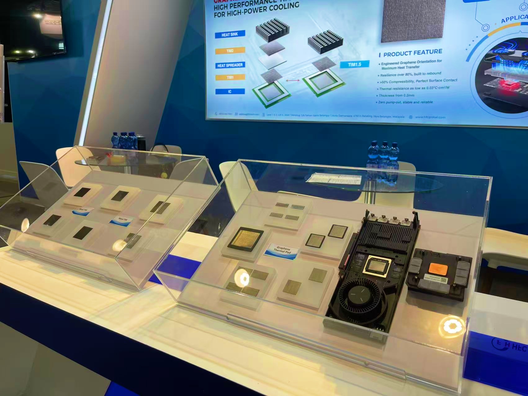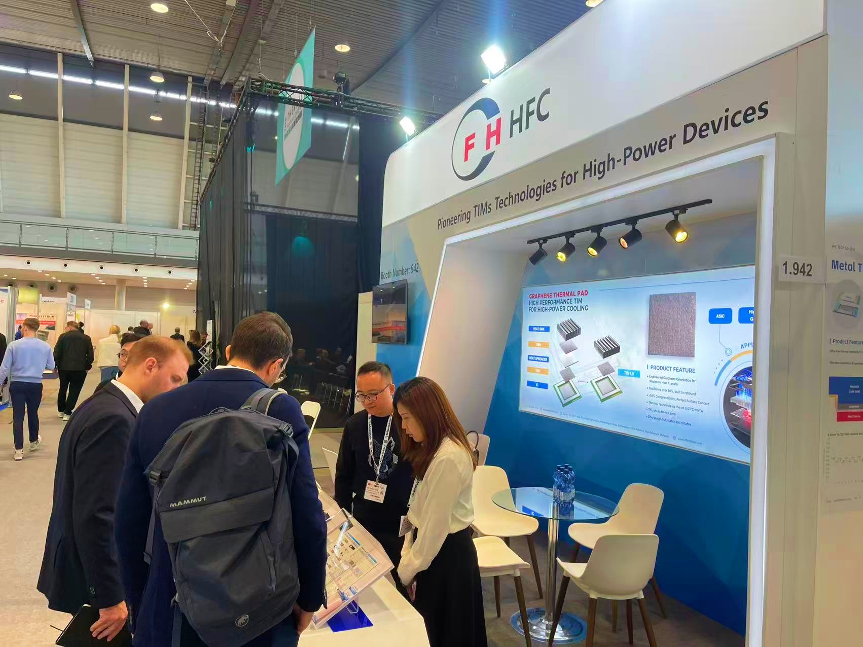On the first day of the expo, HFC's booth became the focus of the entire venue with its "domain-specific solutions + full-scenario product lineup". The core products showcased in a concentrated manner on-site include graphene thermal conductive gaskets (with a thermal conductivity of up to 130W/m·K and a thermal resistance as low as 0.04℃·cm²/W, suitable for high-density heat dissipation needs in scenarios such as automotive electronics) and high-reliability thermal conductive gels (non-volatile, with resistance to high and low temperatures ranging from -50℃ to 200℃, meeting the strict environmental standards for aerospace). These products cover fields such as AI high-power chips, optical modules, data centers, 5G communications, intelligent automotive driving, and consumer terminals, accurately matching the urgent demand of the European market for "high-performance + green and low-carbon" thermal management solutions. Many local European automotive parts manufacturers and industrial electronics enterprises gave "exceeding expectations" evaluations on the thermal conductivity efficiency and adaptability of the products.