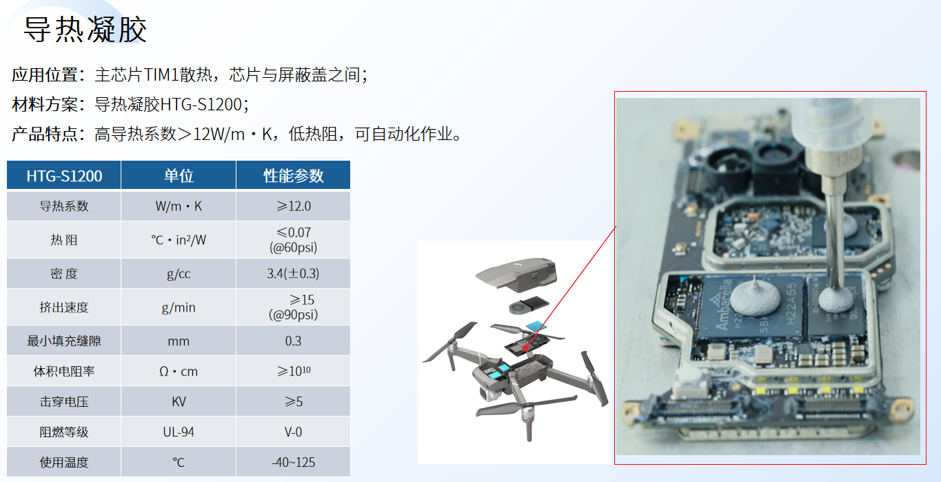 鸿富诚HTG-S系列产品涵盖从2~12w/m.k单组分凝胶 ,HTG-S1200 导热系数高达 12.0 W/m・K,特别适用于无人机主控芯片TIM1芯片与屏蔽盖之间散热;搭配HTG-S500应用于主控芯片TIM2屏蔽盖与散热器之间;实测数据显示,应用后无人机主控芯片核心温度可直降 18.9℃,从 62℃高危区降至 43.1℃安全区间,保障无人机处于舒适温度域。