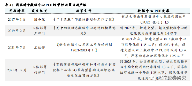 数据中心PUE管控日趋严格,针对老旧与新建数据中心均出台强力约束措施。国家与地方出台了一系列政策对数据中心能耗管理进行规范,不断强调数据中心绿色高质量发展的重要性。2021年7月,工信部印发《新型数据中心发展三年行动计划(2021-2023年)》,要求到2021年底,新建大型及以上数据中心PUE降低到1.35以下;到2023年底,新建大型及以上数据中心PUE降低到1.3以下,严寒和寒冷地区降低到1.25以下。2022年8月,工信部等七部门印发《信息通信行业绿色低碳发展行动计划(2022-2025年)》,要求到2025年,全国新建大型、超大型数据中心电能利用效率(PUE)降到1.3以下,改建核心机房PUE降到1.5以下。除此之外,地方也出台了一系列数据中心PUE要求相关的政策文件,其中北京针对数据中心的年能源消耗量设立了多层次PUE要求,年能源消耗量越高的数据中心PUE要求越高,此外还针对PUE超过1.4的数据中心实行电价加价措施。