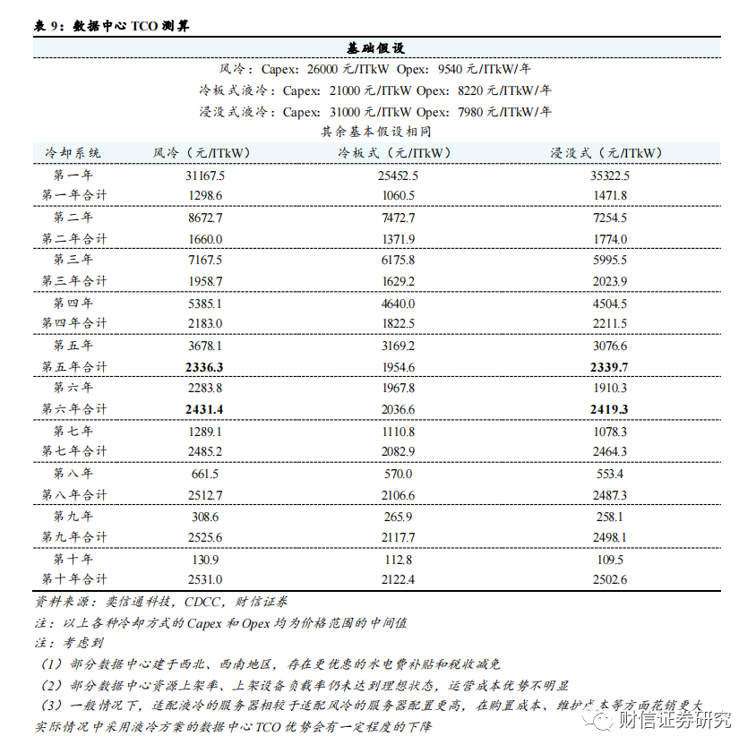 现阶段选择冷板式液冷的初始TCO已经低于风冷,浸没式液冷的TCO将在5-6年之后低于风冷。我们根据以上测算结果进行10年期的TCO测算,那么风冷的Capex和Opex分别为26000元/ITkW和9540元/ITkW/年,冷板式液冷的Capex和Opex分别为21000元/ITkW和8220元/ITkW/年,浸没式液冷的Capex和Opex分别为31000元/ITkW和7980元/ITkW/年。根据TCO测算,现阶段冷板式液冷方案的TCO从开始就已经低于风冷方案,浸没式液冷方案也将在5年左右之后出现TCO低于风冷方案的拐点。