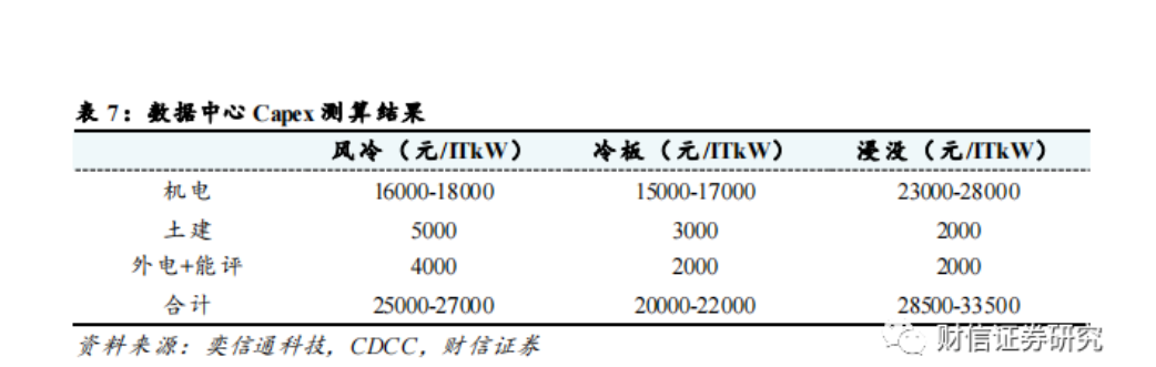 土建部分主要包括建筑物成本。风冷和液冷方案的土建成本差异主要在于同样体量的数据中心内,液冷方案下建筑所需的建筑面积更小。根据奕信通科技测算,风冷、冷板式液冷、浸没式液冷的土建部分Capex分别为5000元/ITkW,3000元/ITkW和3500元/ITkW左右。