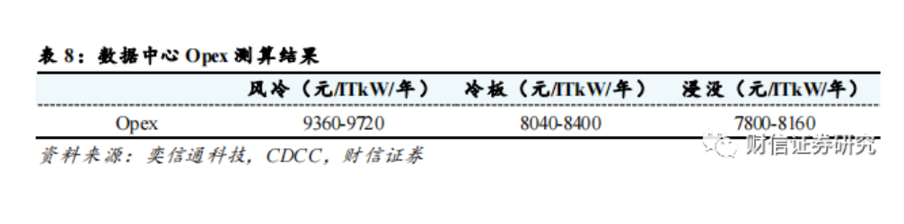 浸没式液冷方案的Opex最具优势。根据奕信通科技测算,风冷方案的Opex为9360-9720元/ITkw/年左右,冷板式液冷方案的Opex为8040-8400元/ITkw/年左右,浸没式液冷方案的Opex是7800-8160元/ITkw/年左右。