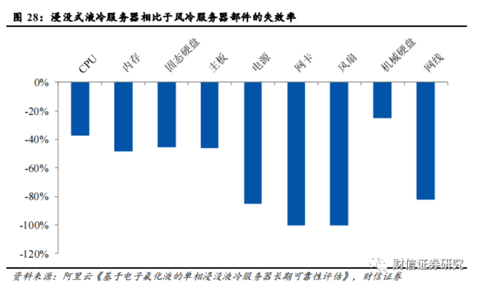 液冷能够有效降低服务器部件故障率,延长使用寿命。液体具有比空气更大的比热容,散热能力更强,使得服务器温度更加稳定,CPU和GPU计算部件可以长时间稳定工作在高性能频率状态。此外,浸没式液冷将IT设备浸入封闭的液体环境中,与空气完全隔离,并且不再需要高速风扇进行散热,消除了空气湿度、风扇振动以及灰尘带来的可靠性影响,从而优化了服务器的运行环境,延长了设备的使用寿命。根据阿里云的实验数据,与风冷服务器相比,液冷服务器整体部件故障率下降约53%,其中电源、网卡、风扇、网线等部件的故障率下降超过80%。随着单服务器价值量以及数据中心运营成本的与日俱增,服务器的可靠性与使用寿命显得尤为重要,液冷带来的附加经济价值有望逐步显现。