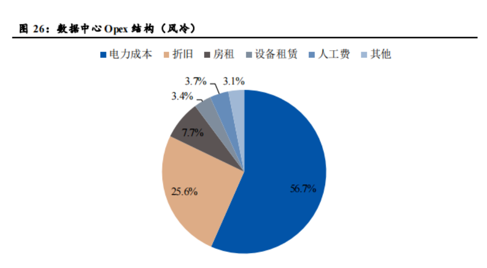 Opex中占比最高的是电力成本,液冷技术可以有效降低电力成本。数据中心的Opex主要包括电力成本、固定资产折旧、房租、人工费等等,其中电力成本占比最高,达到56.7%(风冷情况下)。